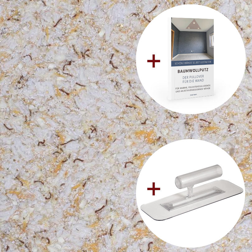 Das Probierpaket Deluxe 36 enthält einen Beutel mit 250 g Baumwollputz für ca. 1 m² Wandfläche, unsere beliebte transparente Glättkelle mit abgerundeten Ecken und das Buch "Baumwollputz - Der Pullover für die Wand" mit vielen Tipps und Tricks und Bildern von Renovierungsarbeiten unserer Kunden.