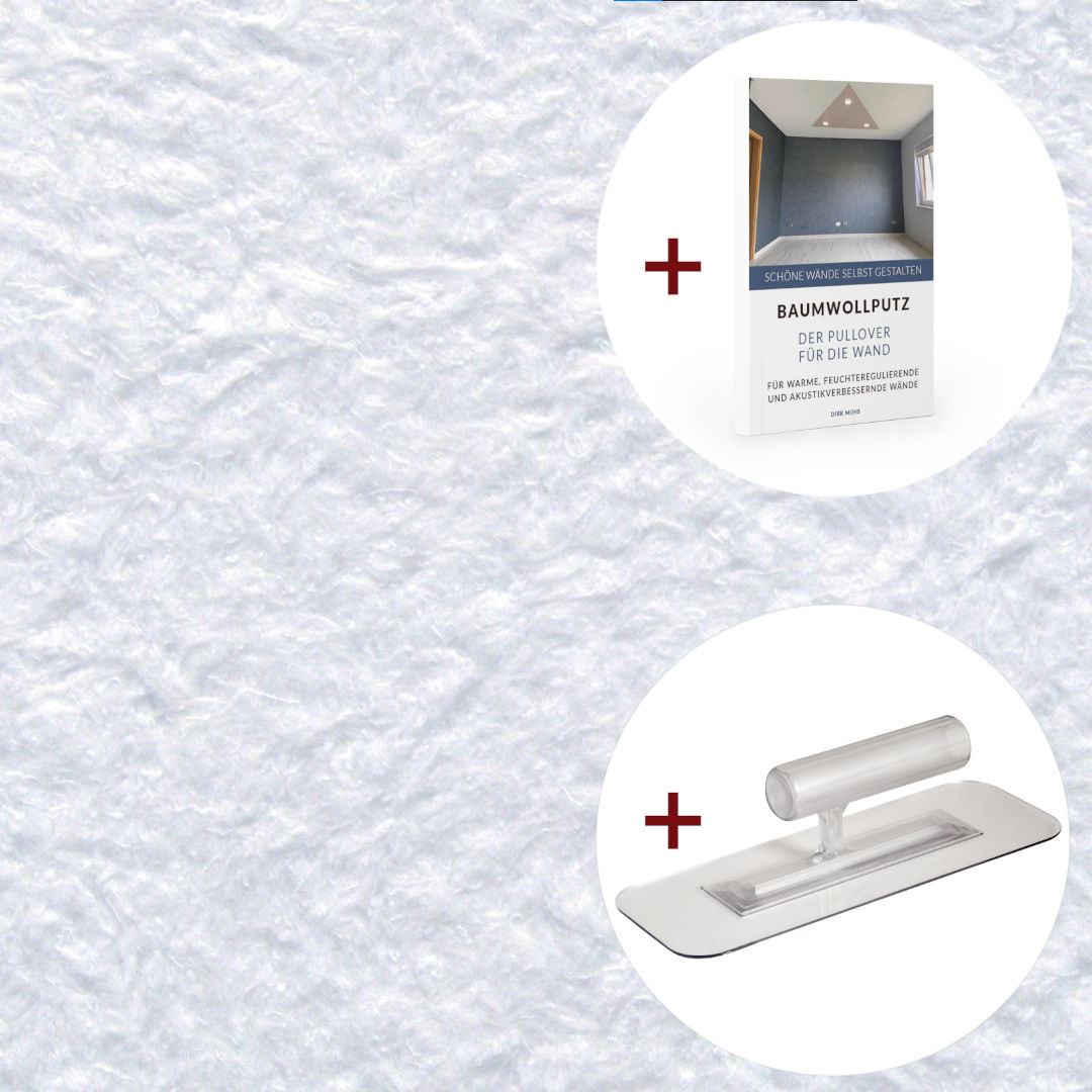 The color decor white coarse trial package contains a bag with 250g cotton plaster for approx. 1 m² of wall surface, our popular transparent smoothing trowel with rounded corners and the book "Cotton plaster - The sweater for the wall" with many tips and tricks and pictures of renovation work by our customers.