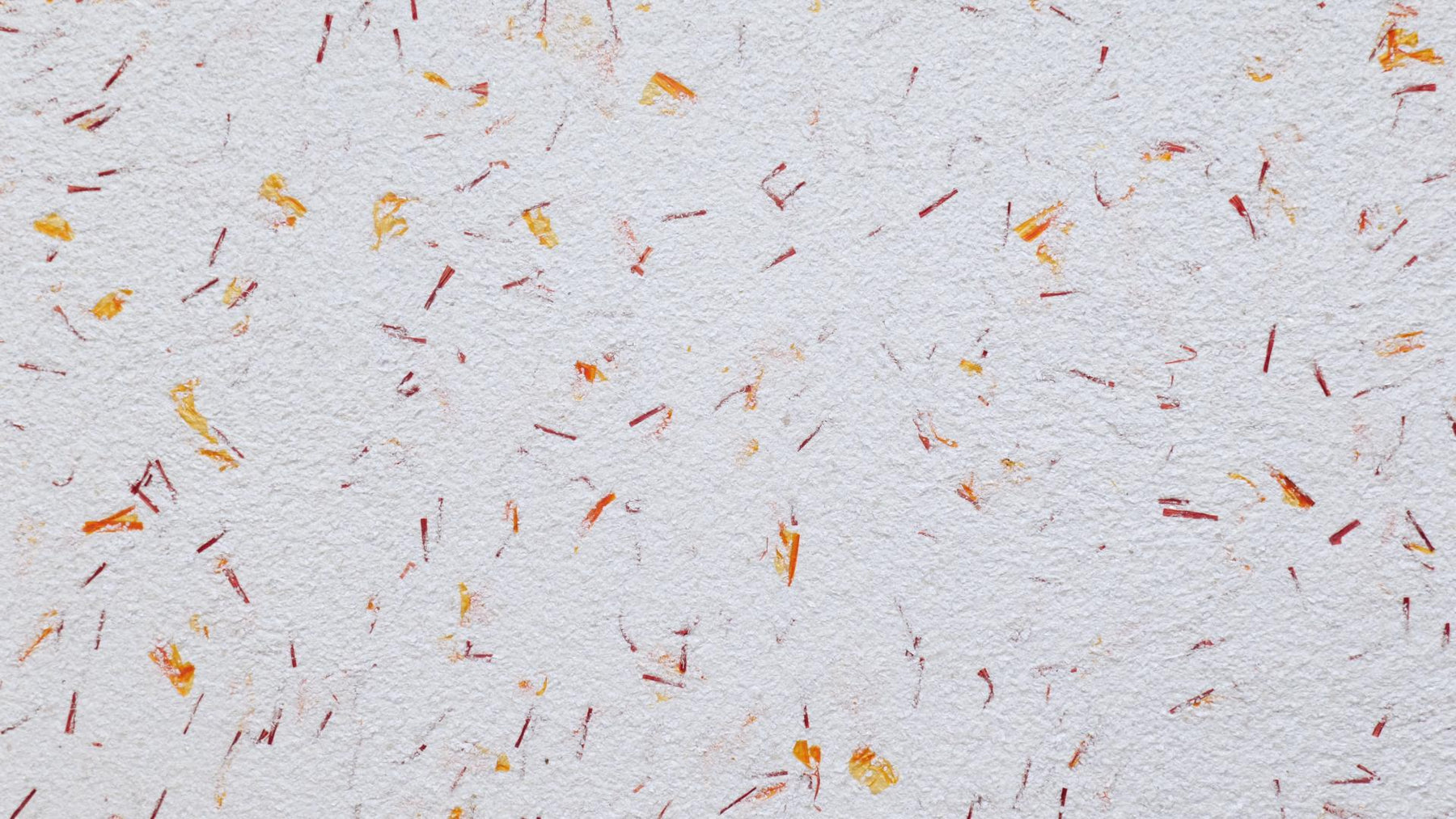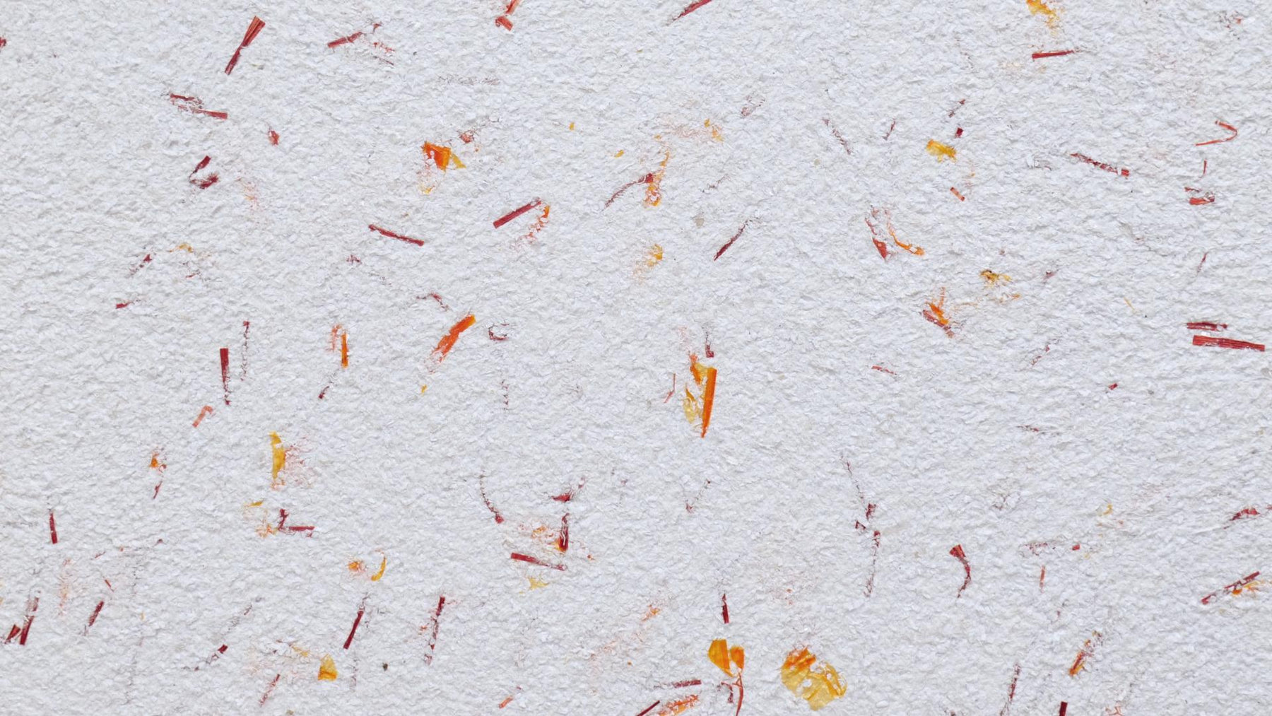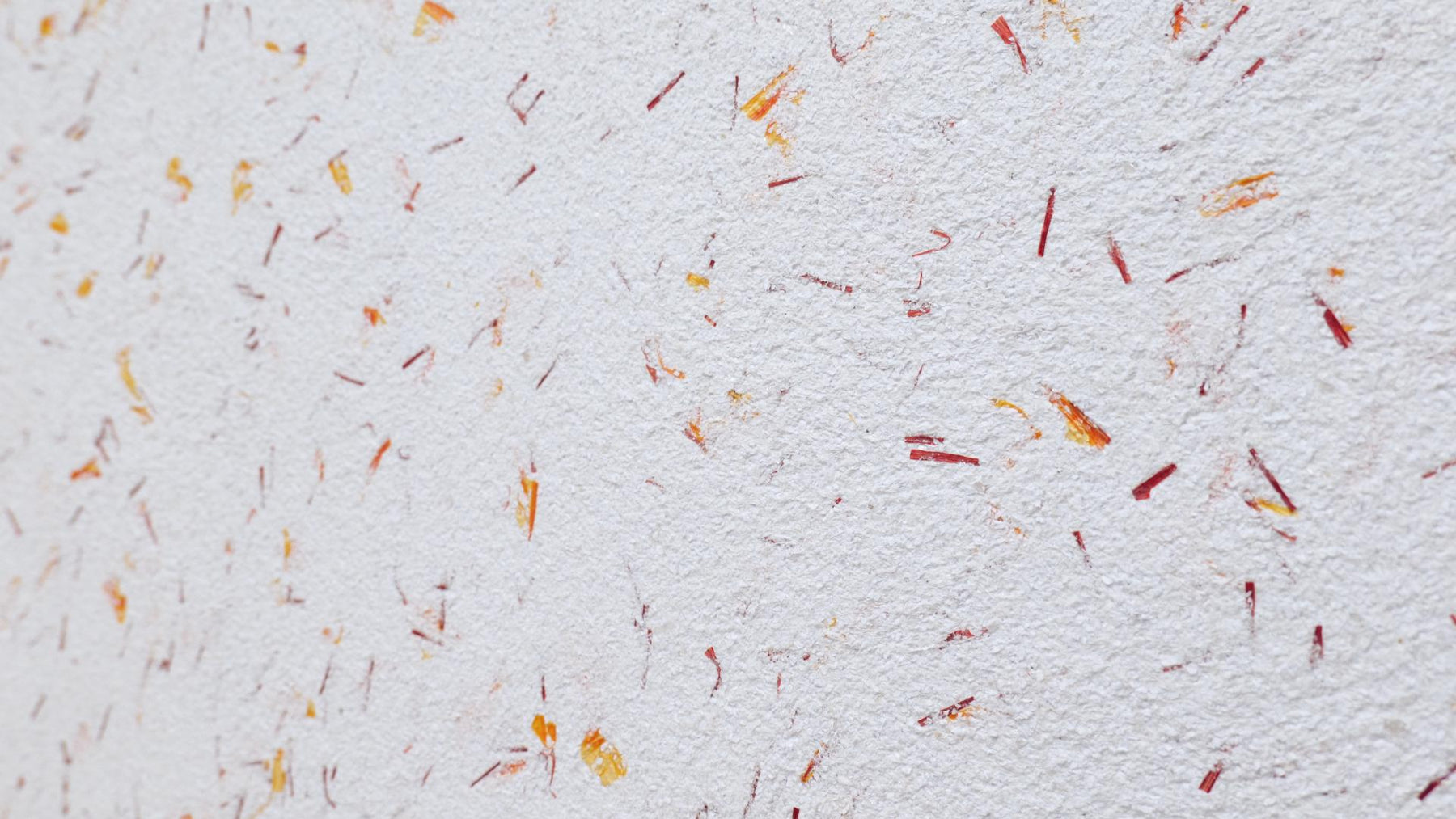 Fine white cotton plaster with small red and coarse orange bamboo effects and natural mica.