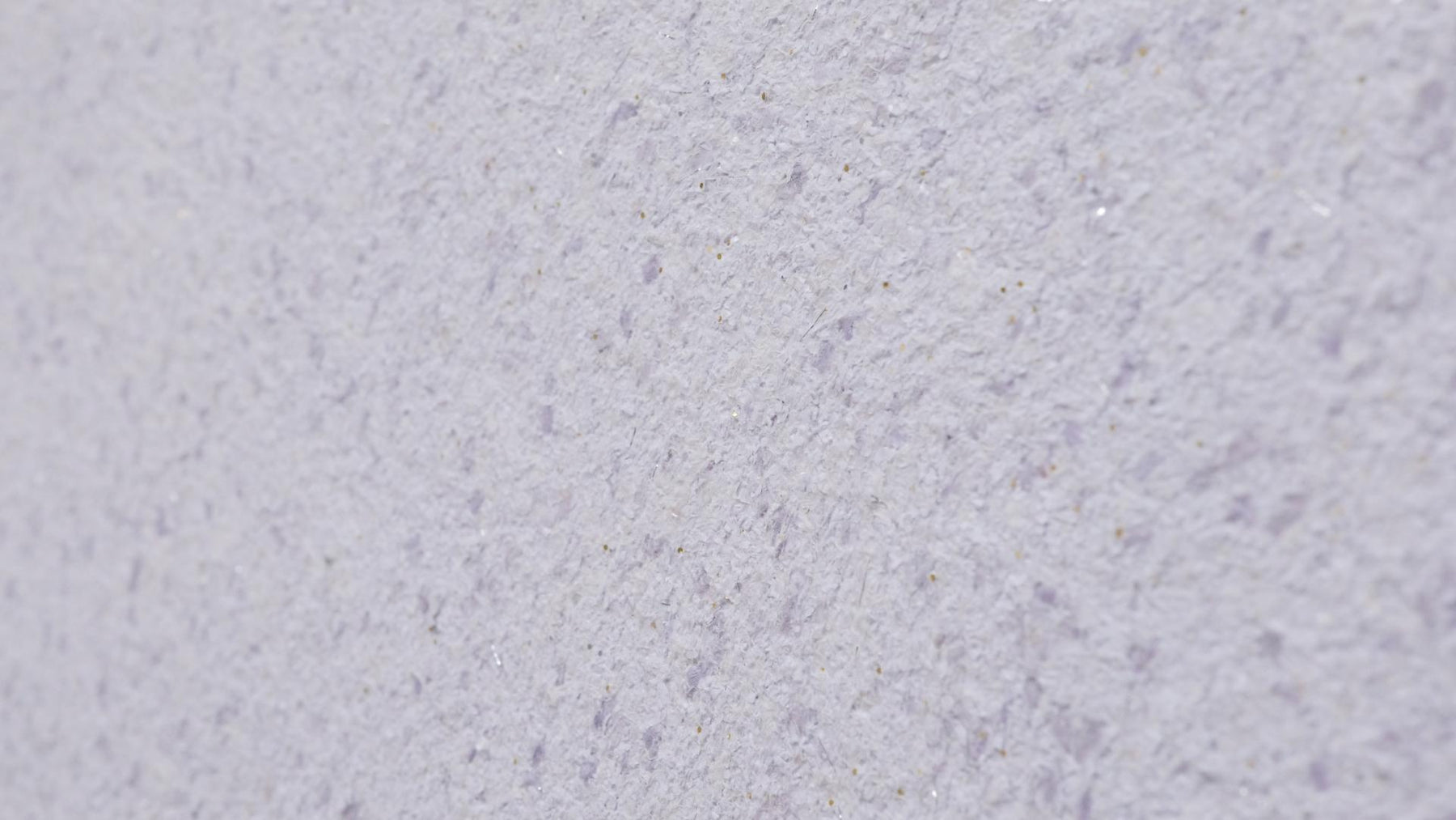 Feiner weißer Baumwollputz mit weißen Cellulosestückchen, lila Farbflock, Naturglimmer Mica, groben Gold- und Silberglimmer, sowie Metallfäden Silber.