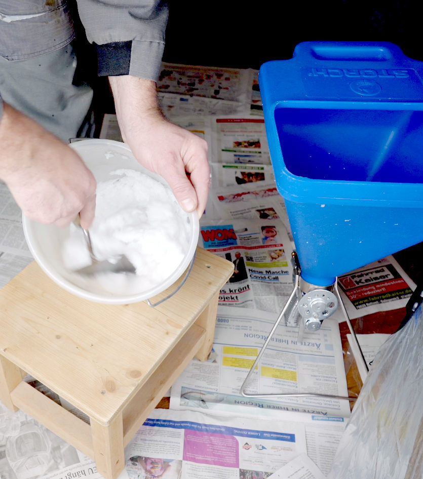 You can make your work a little easier with the spray gun. However, you have to note that the structure is a bit coarser and the amount of water required is increased. Simply start with the highest recommended amount of water and then slowly work your way up until the desired consistency is reached. If you don't have enough cotton plaster, simply order new ones and continue spraying.