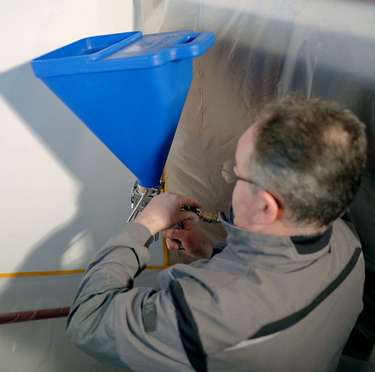 The amount of air is regulated via the tap on the fitting, while the lever in front of the handle is used to regulate the amount of material.