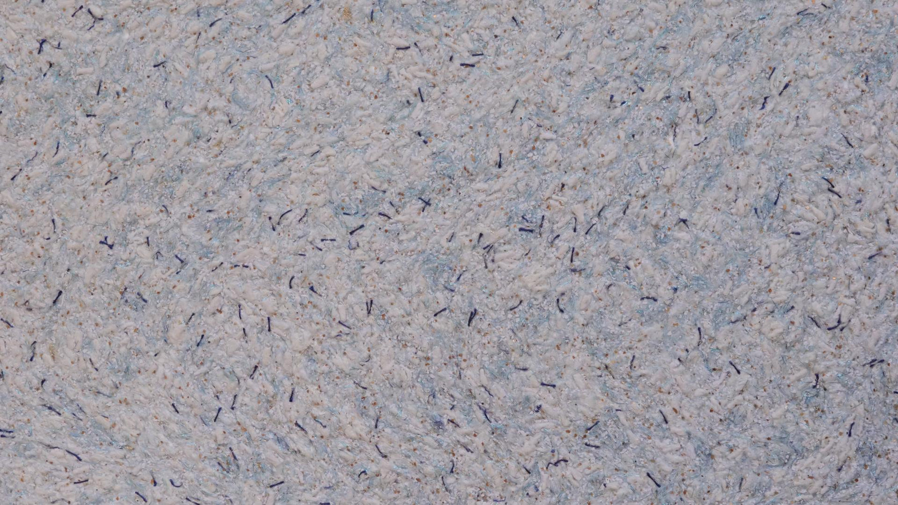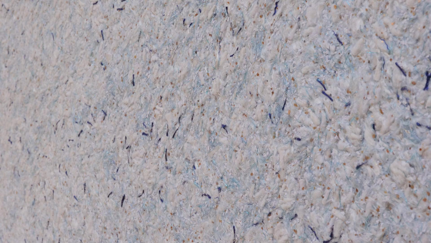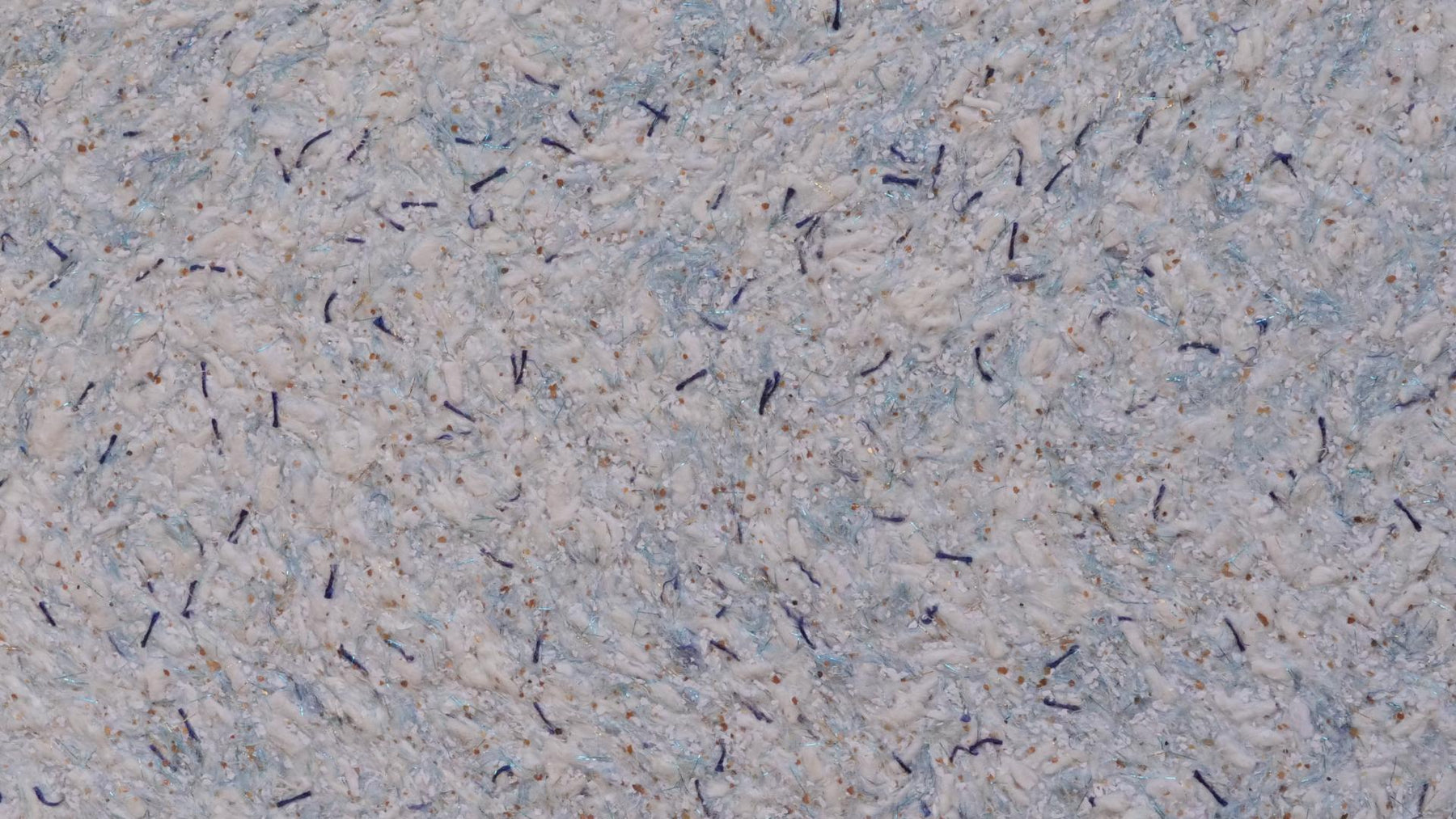 Grober Baumwollputz mit weißen dicken Garnen und hellblauen Farbfasern, dunkelblauen Garnen, sowie Farbchips Gold und goldenen und hellblauen Effektfäden.