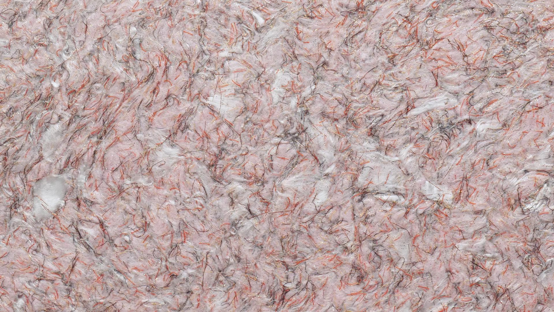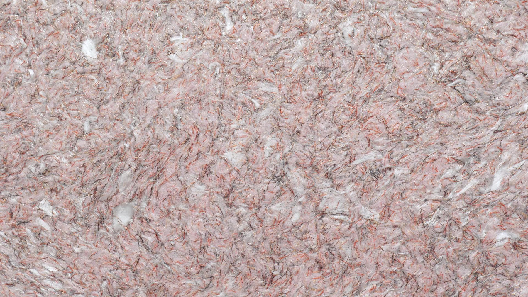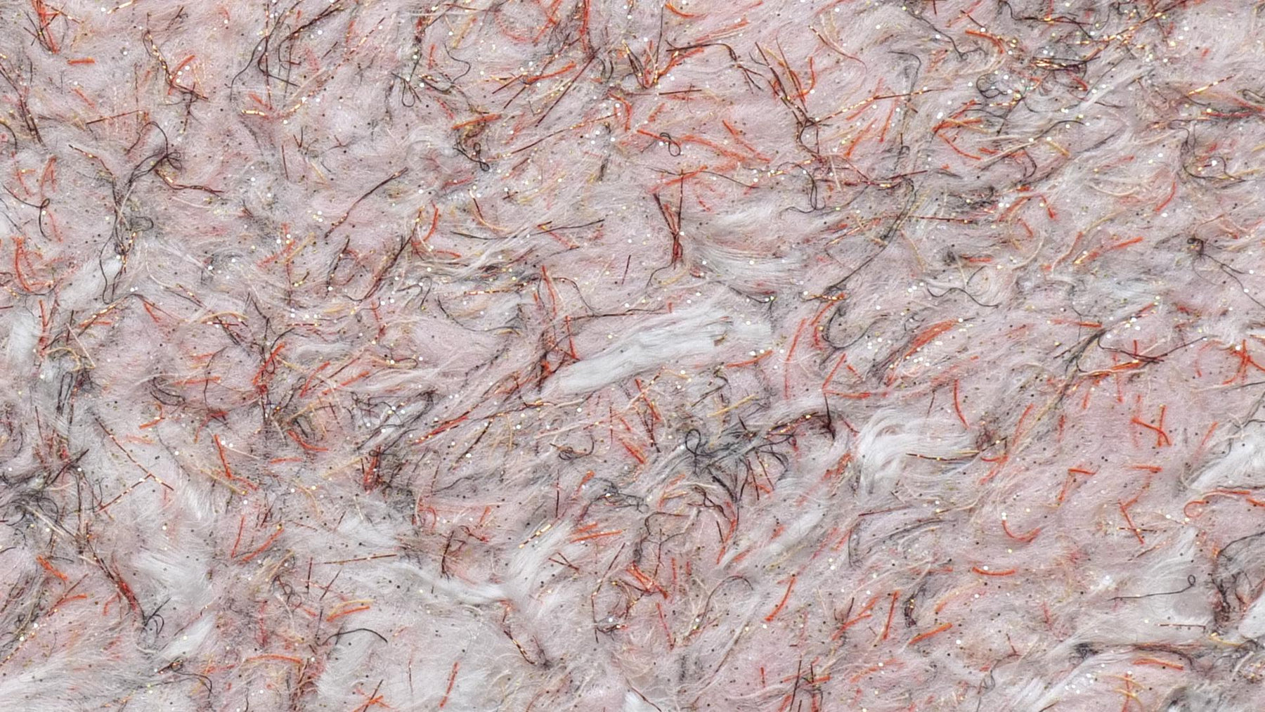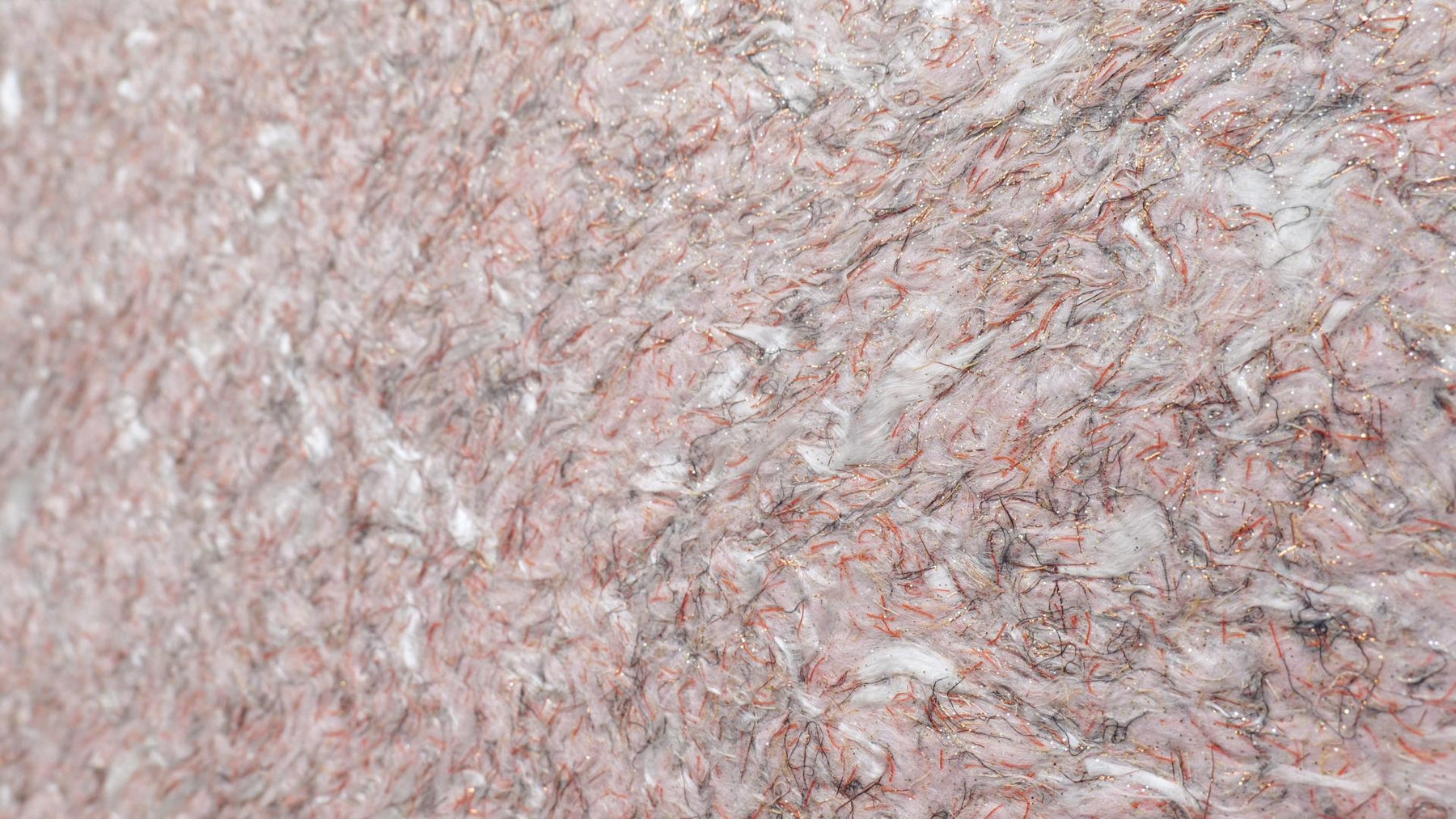 Pink premium textile plaster with white shiny fiber pieces. The following effects are added: orange, black and pink color threads, gold and copper threads with a metal effect as well as gold and silver mica. This textile plaster does not contain any cotton.