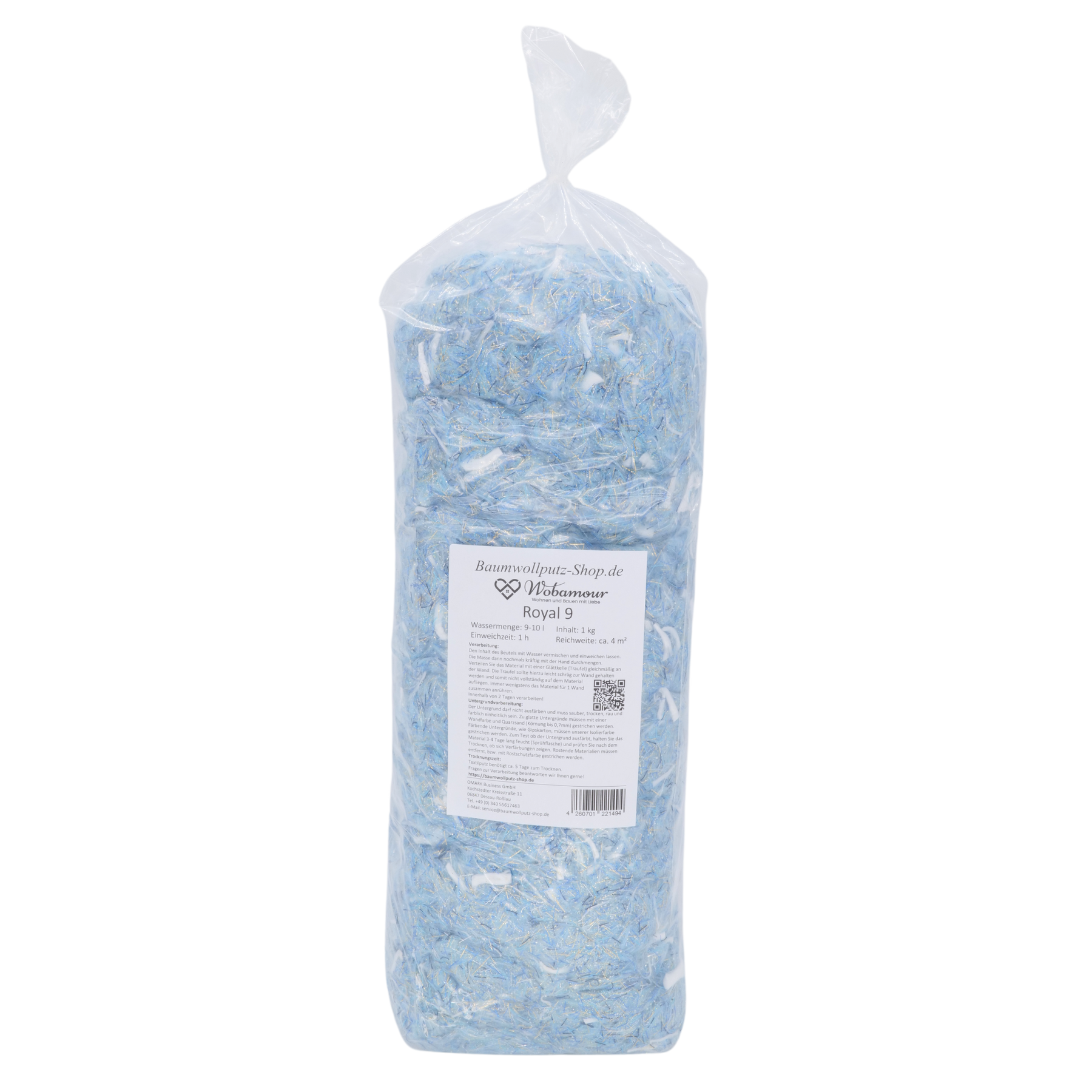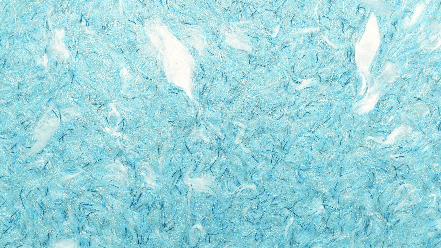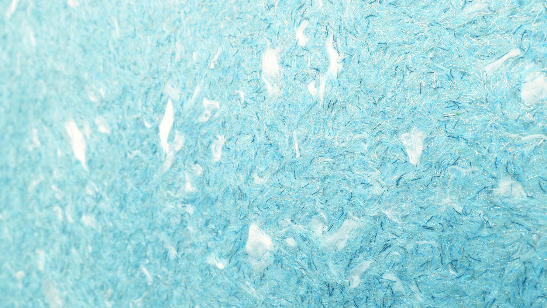 Light blue premium textile plaster with white shiny fiber pieces. The following effects are added: light blue and black colored threads, mica threads with a metal effect in gold, silver, copper and blue as well as gold and silver mica. This textile plaster does not contain any cotton.