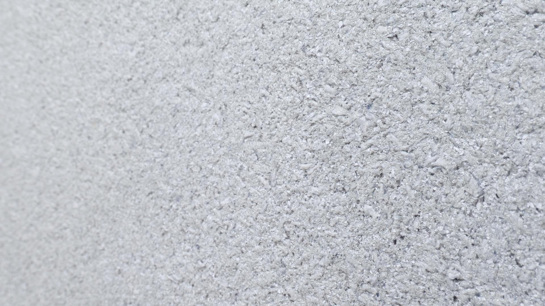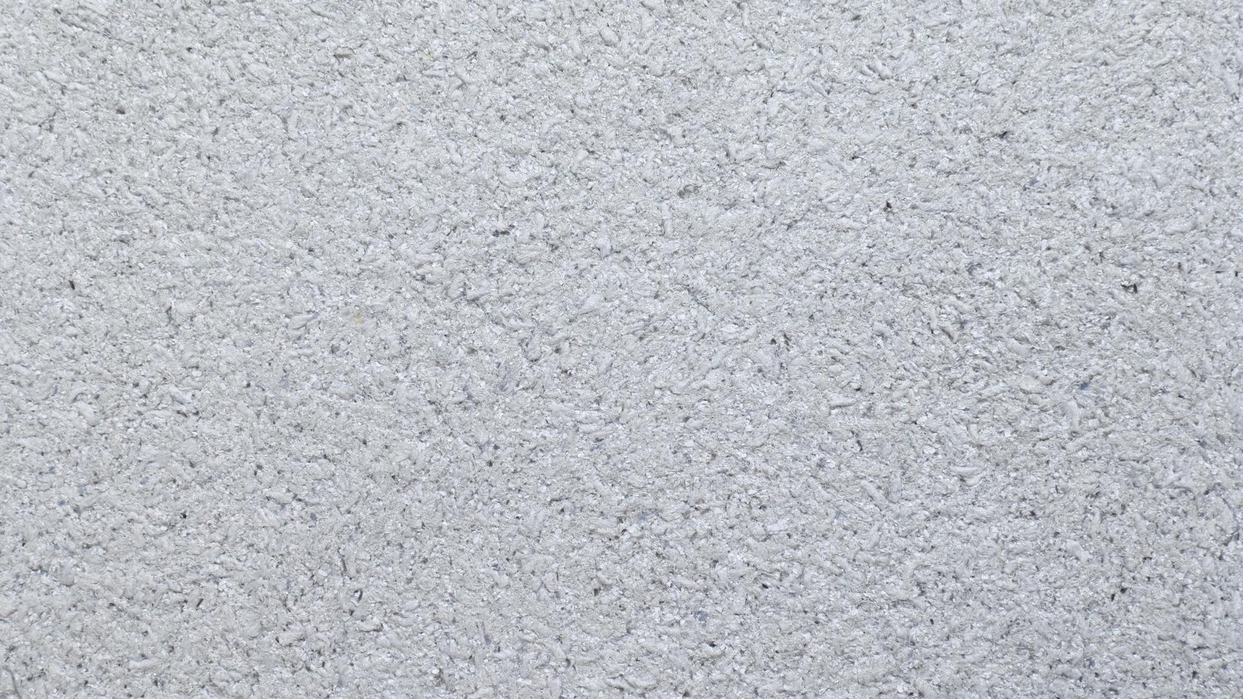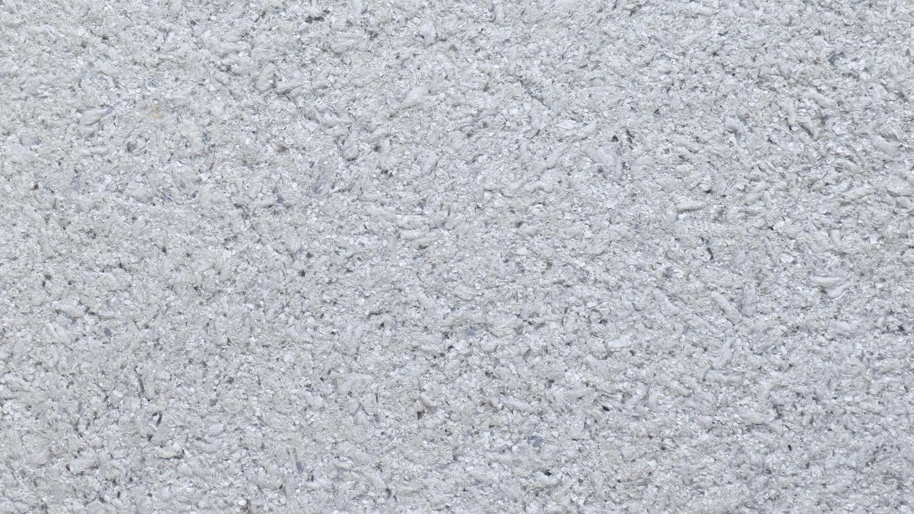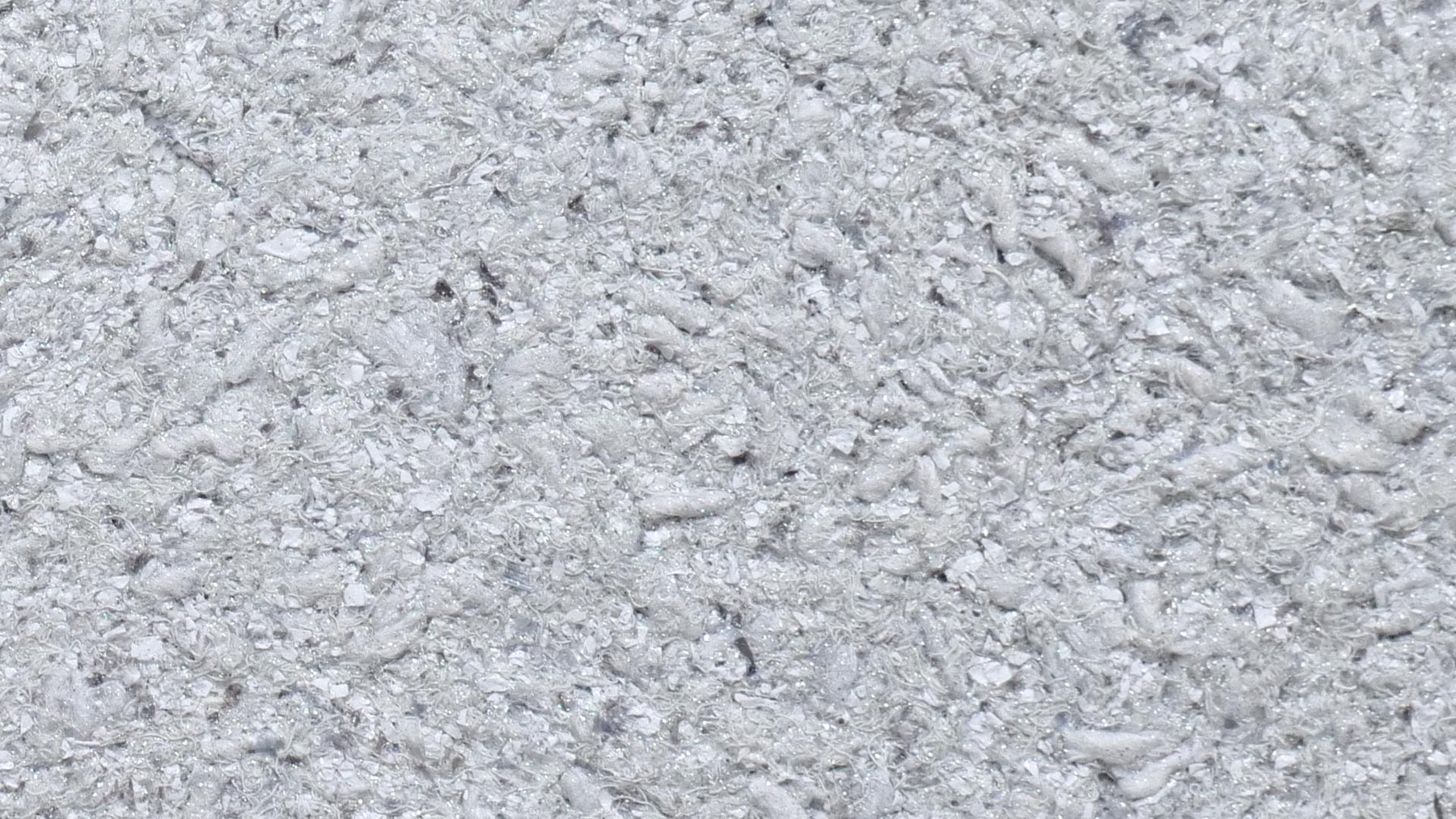 Grober Baumwollputz mit grauen Garnen und Fasern, weißen Zellulosestückchen, feinem Silberglimmer und grauen Effekten.